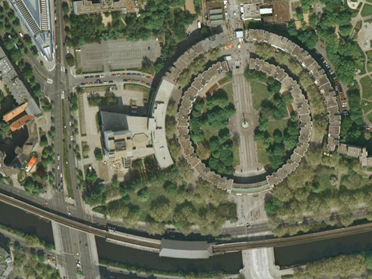 ○二重のアパート群に囲まれている丸い広場が Mehringplatz、